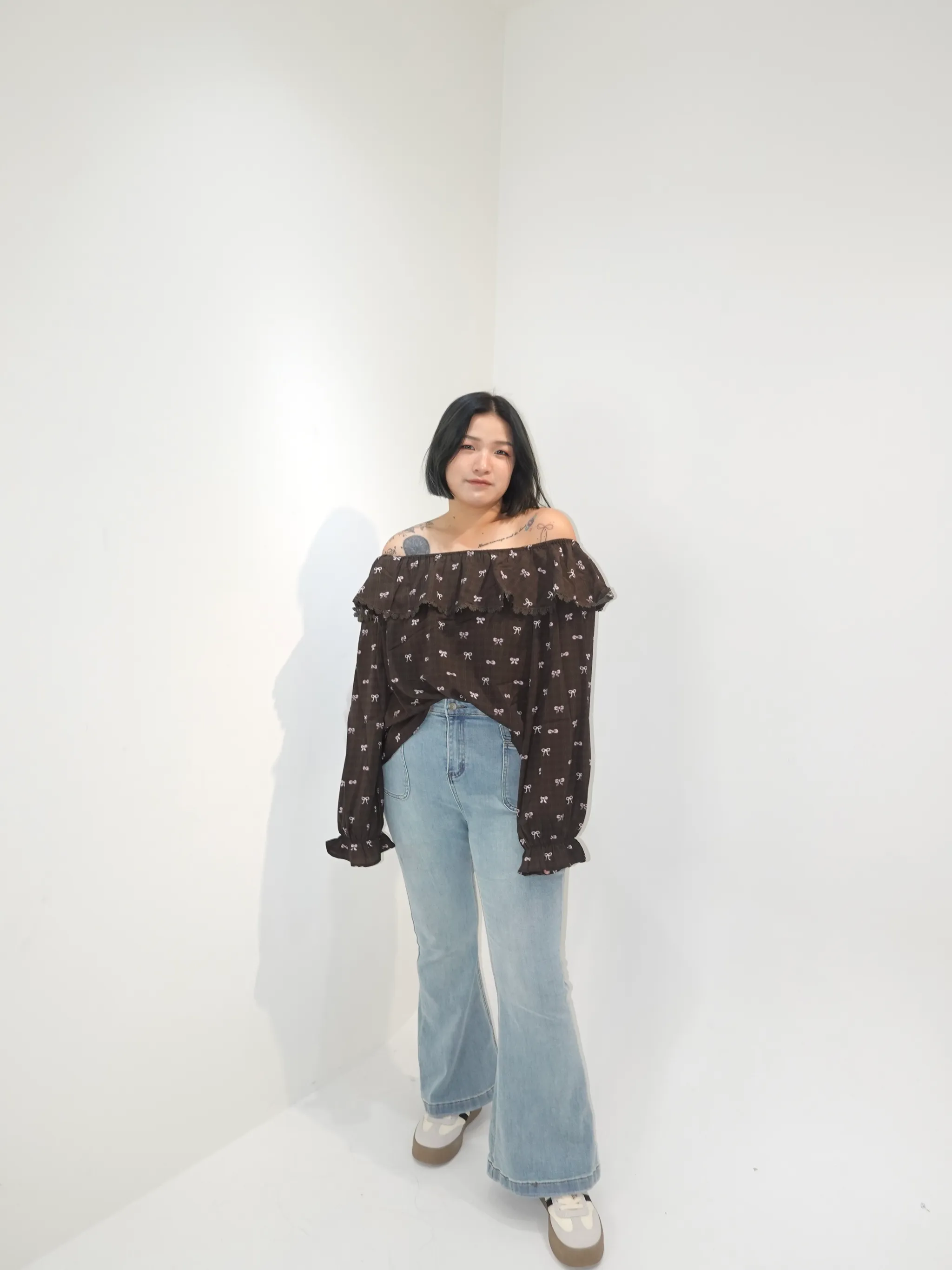 吊帶一字領胸抓皺長袖上衣