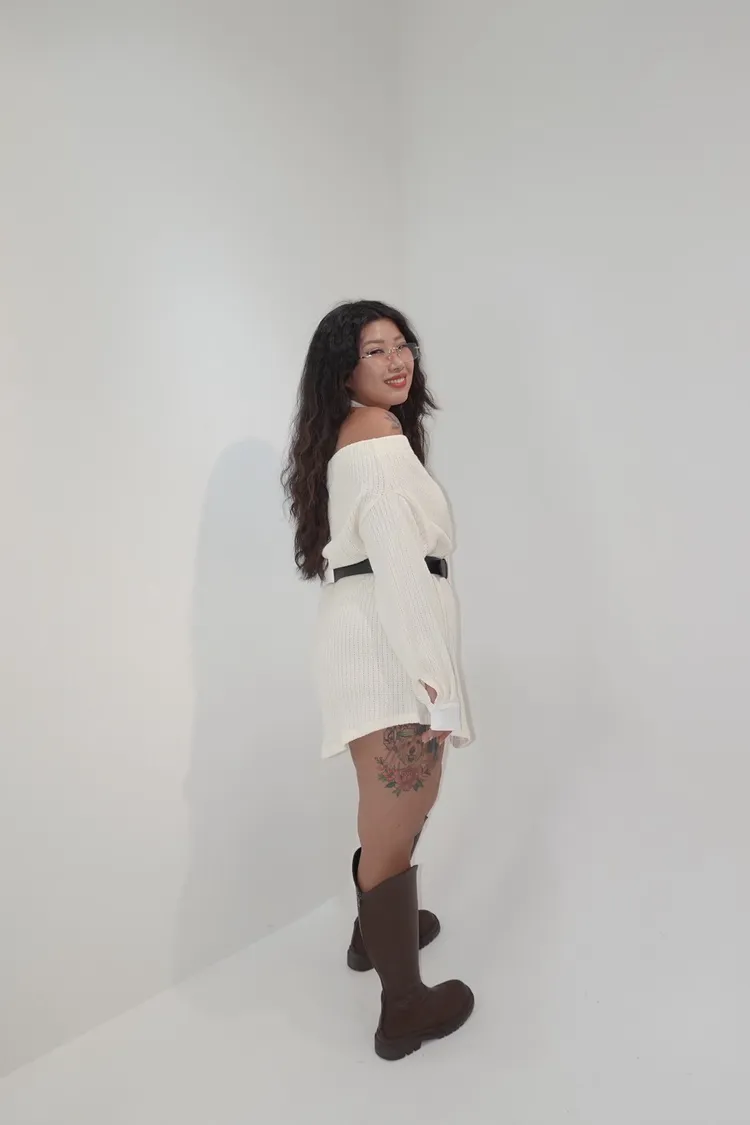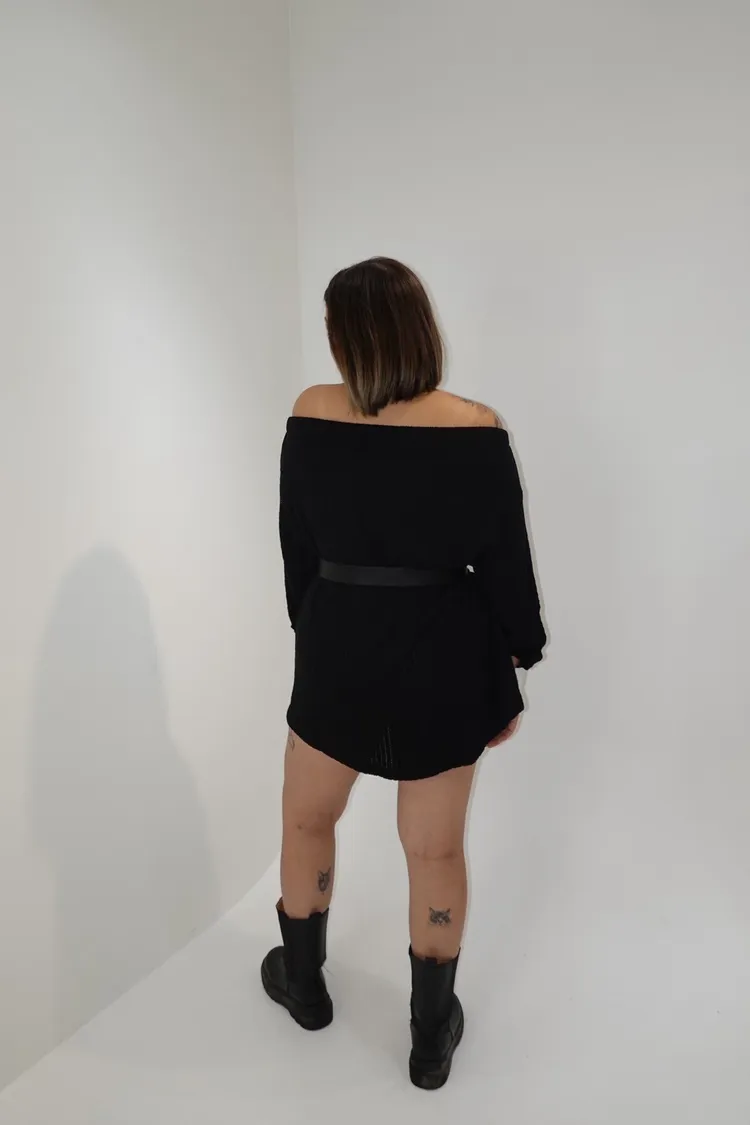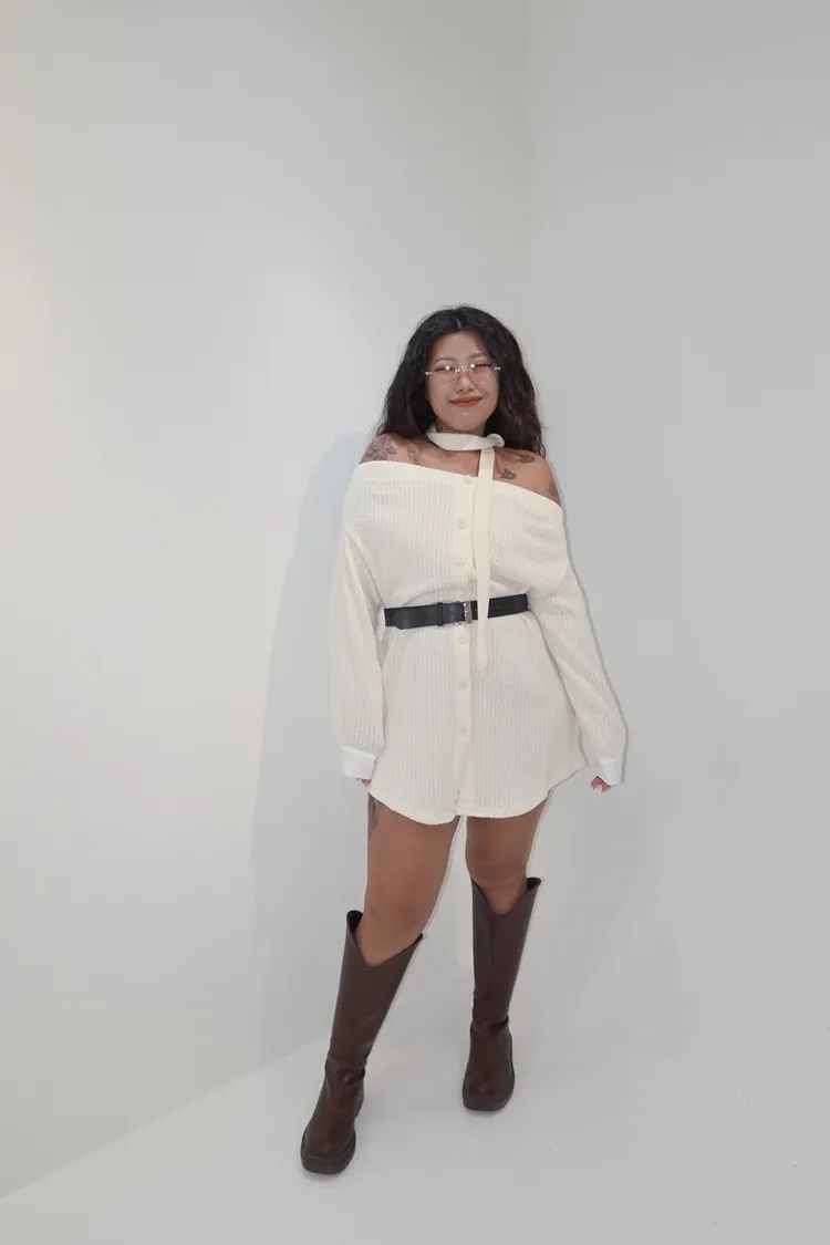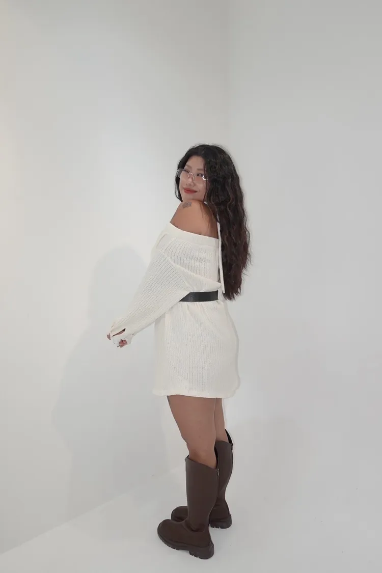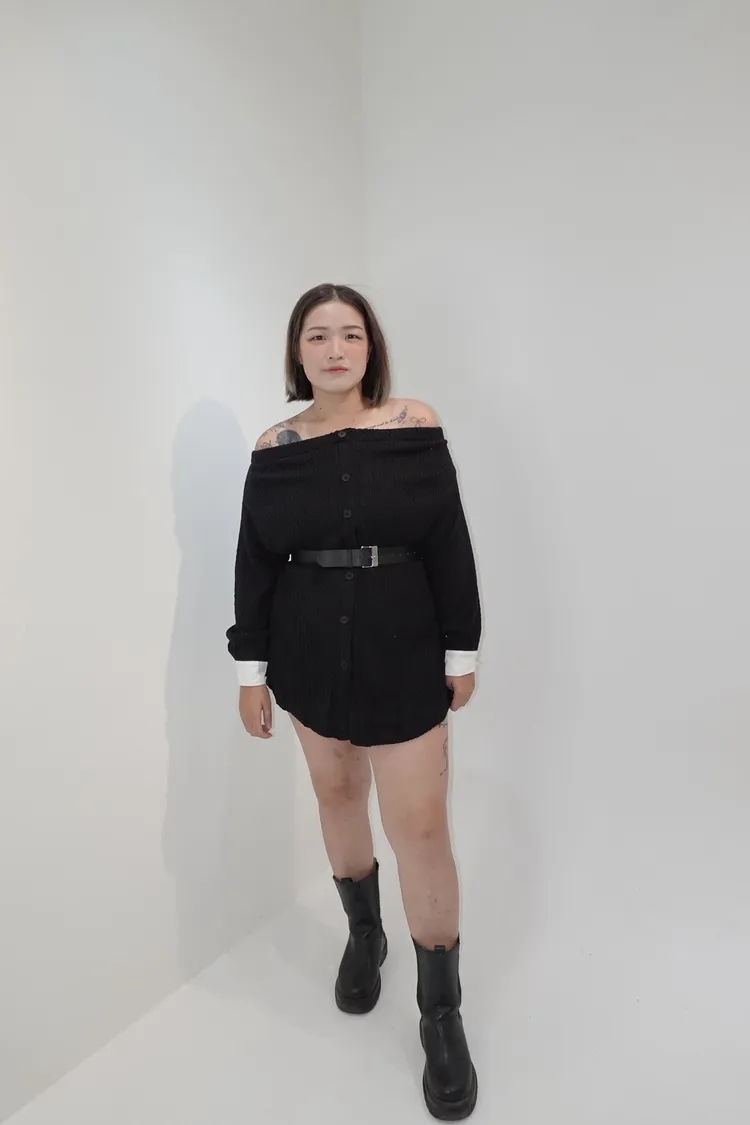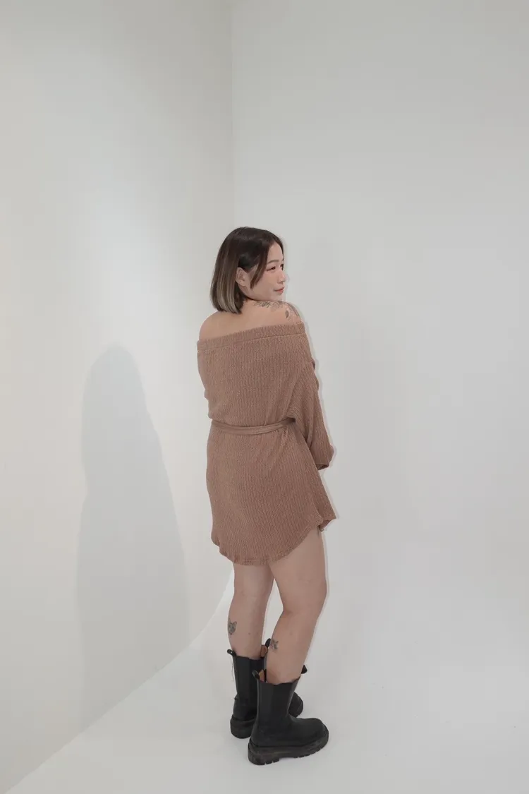 麻花針織一字領下圓擺長版上衣 附綁帶+皮帶