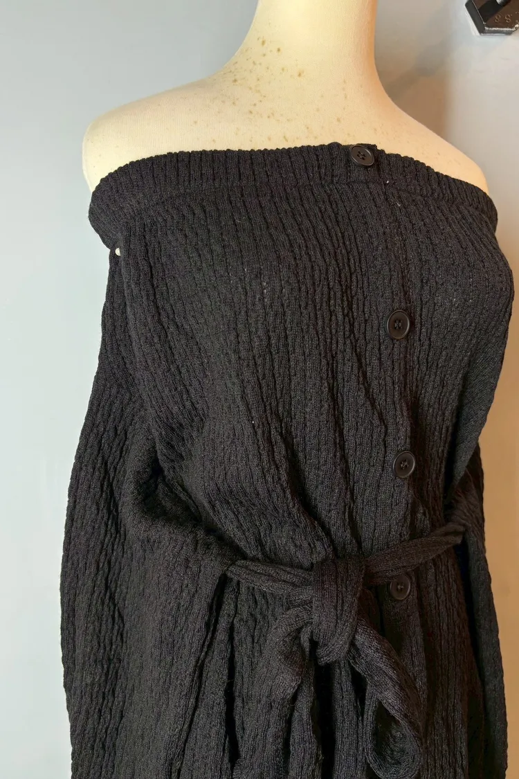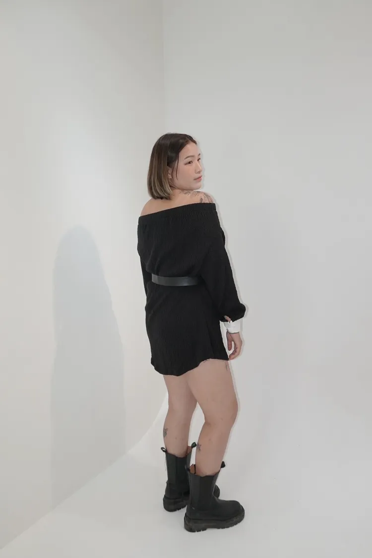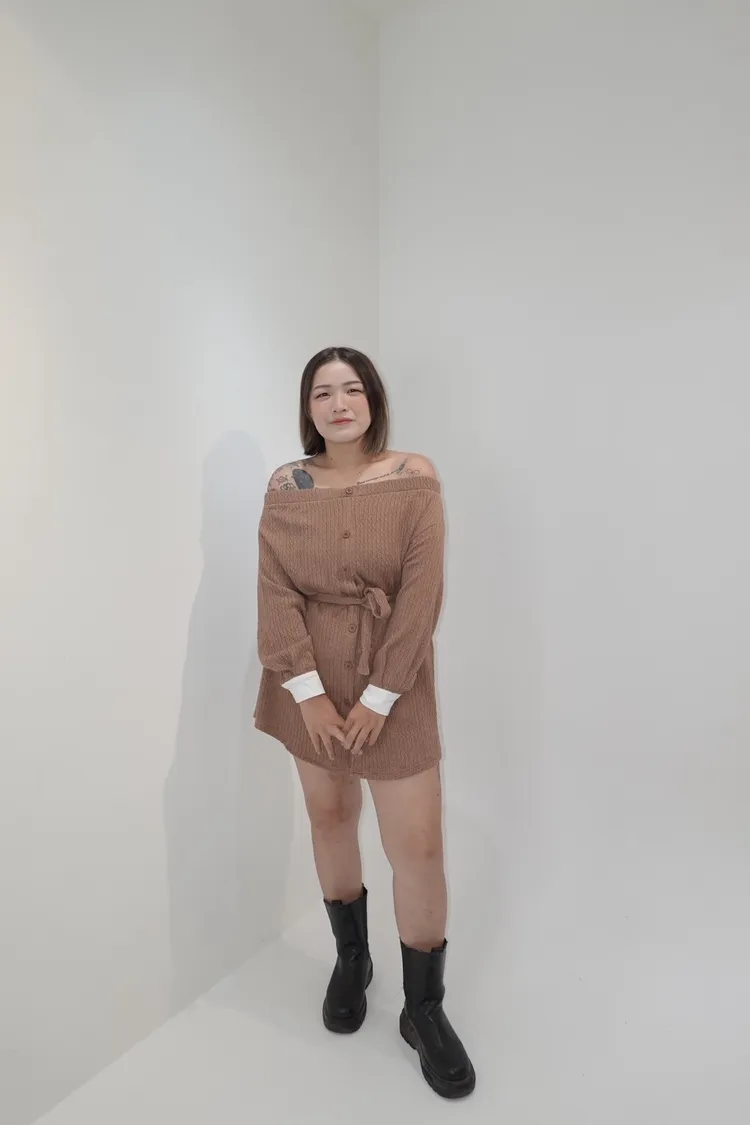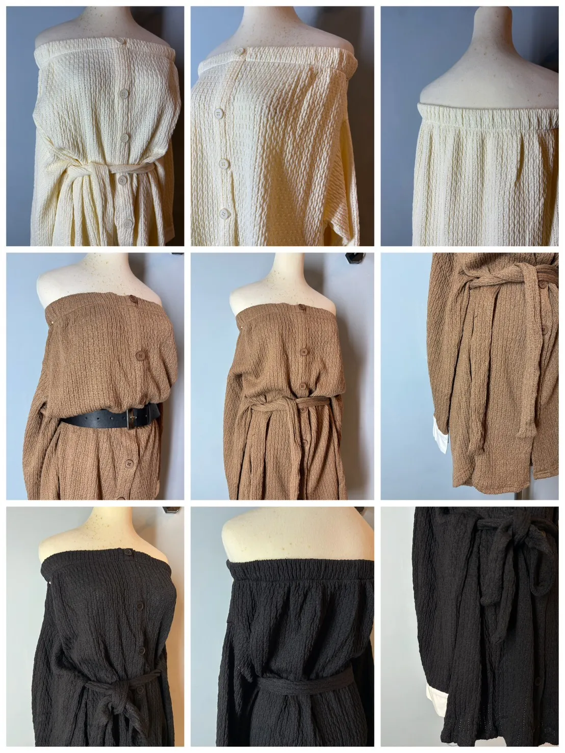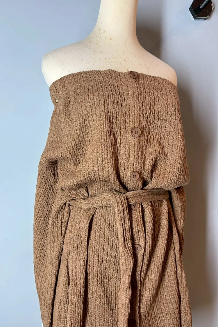 麻花針織一字領下圓擺長版上衣 附綁帶+皮帶