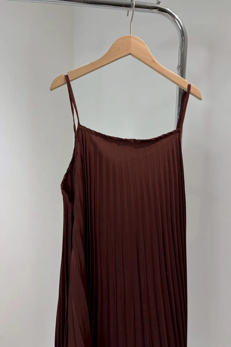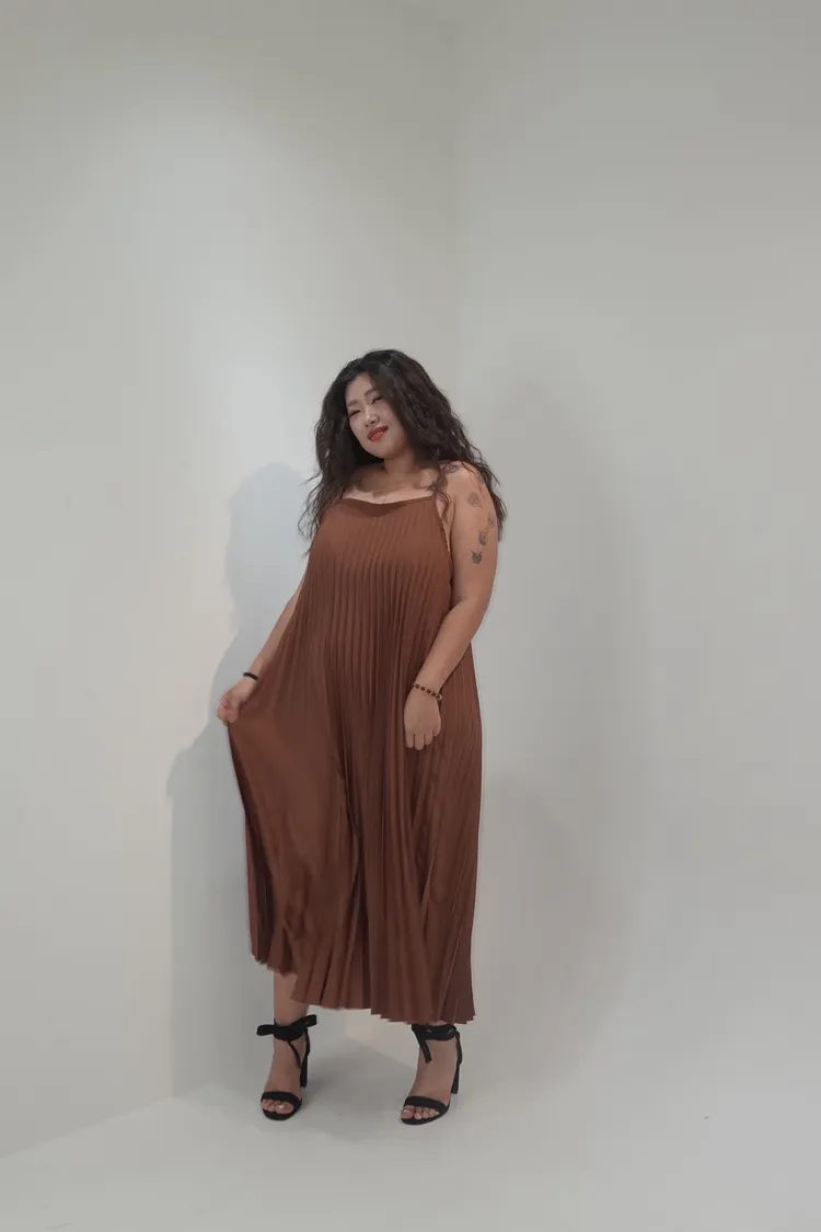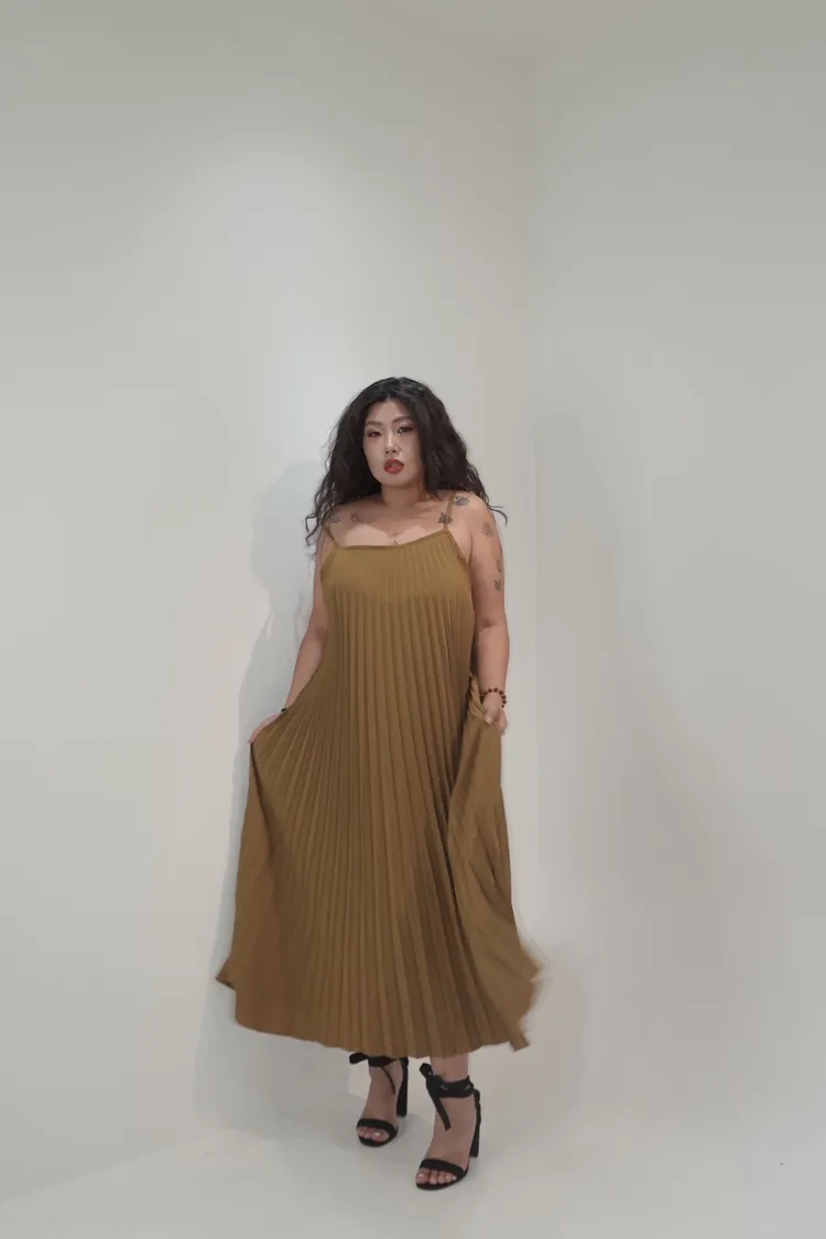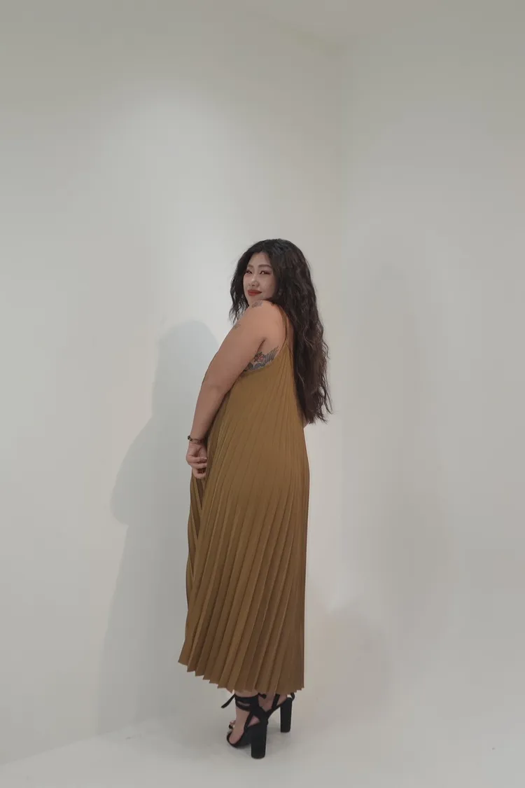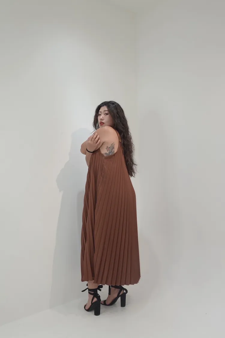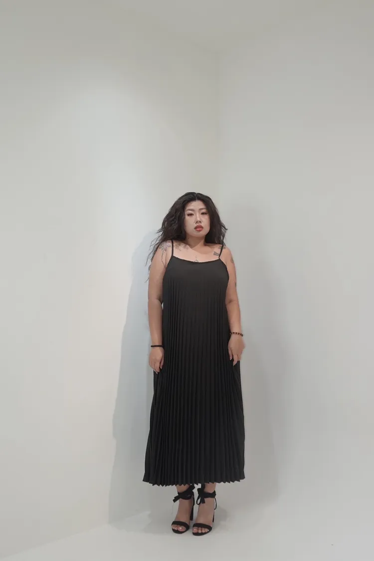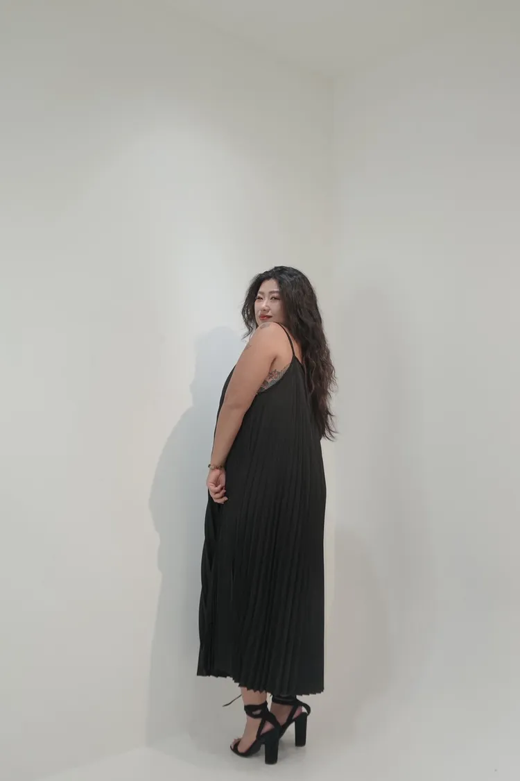 細肩帶壓褶長洋